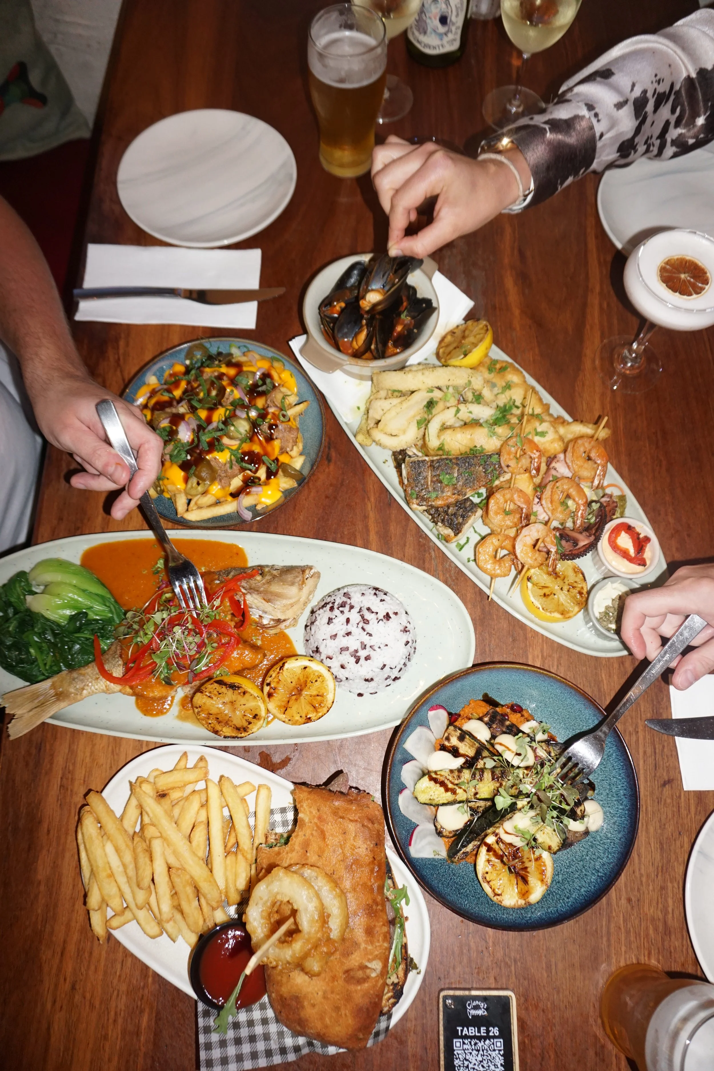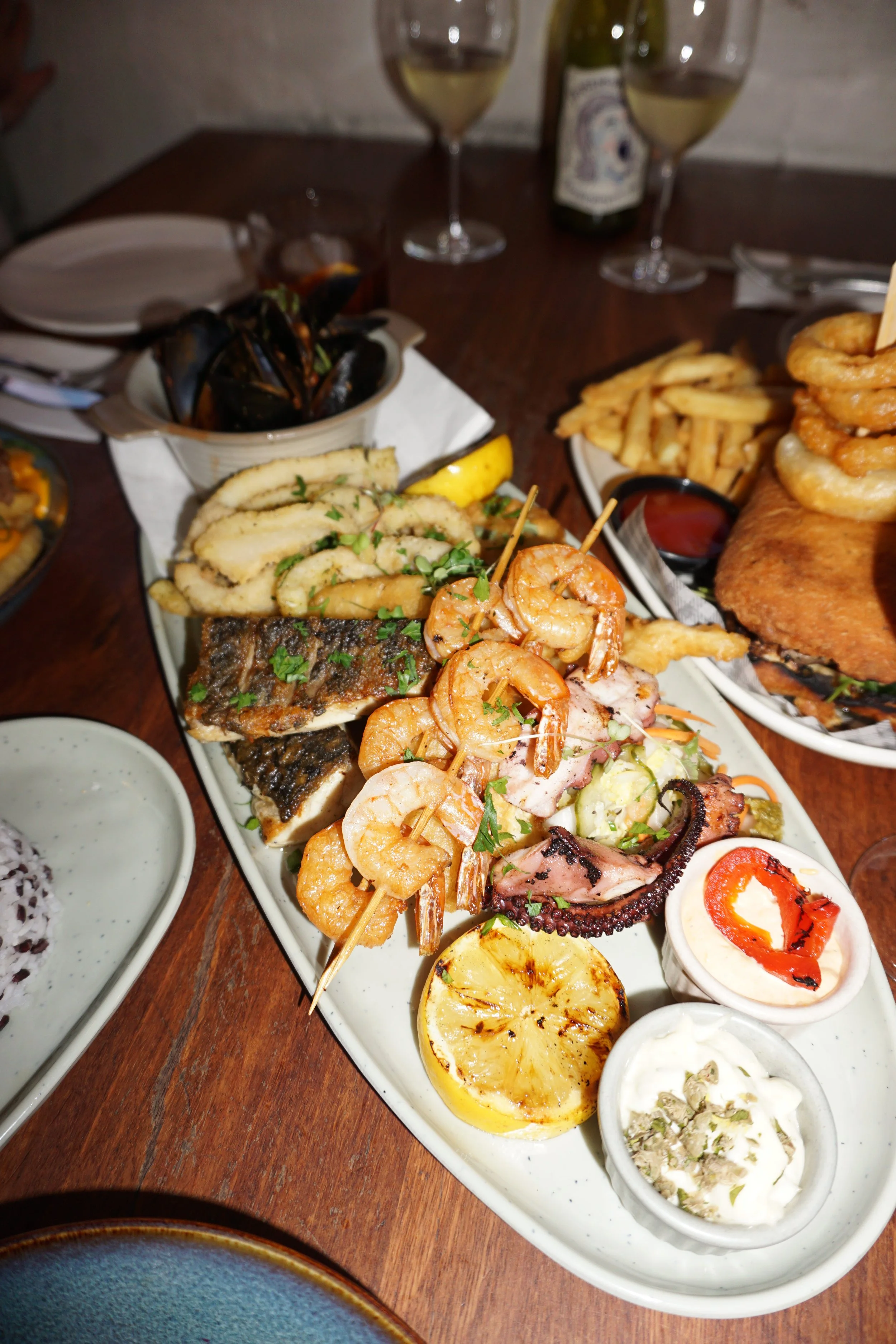 SEAFOOD SHARE battered snapper, grilled barramundi, lemon pepper squid, prawn skewers, paprika octopus,