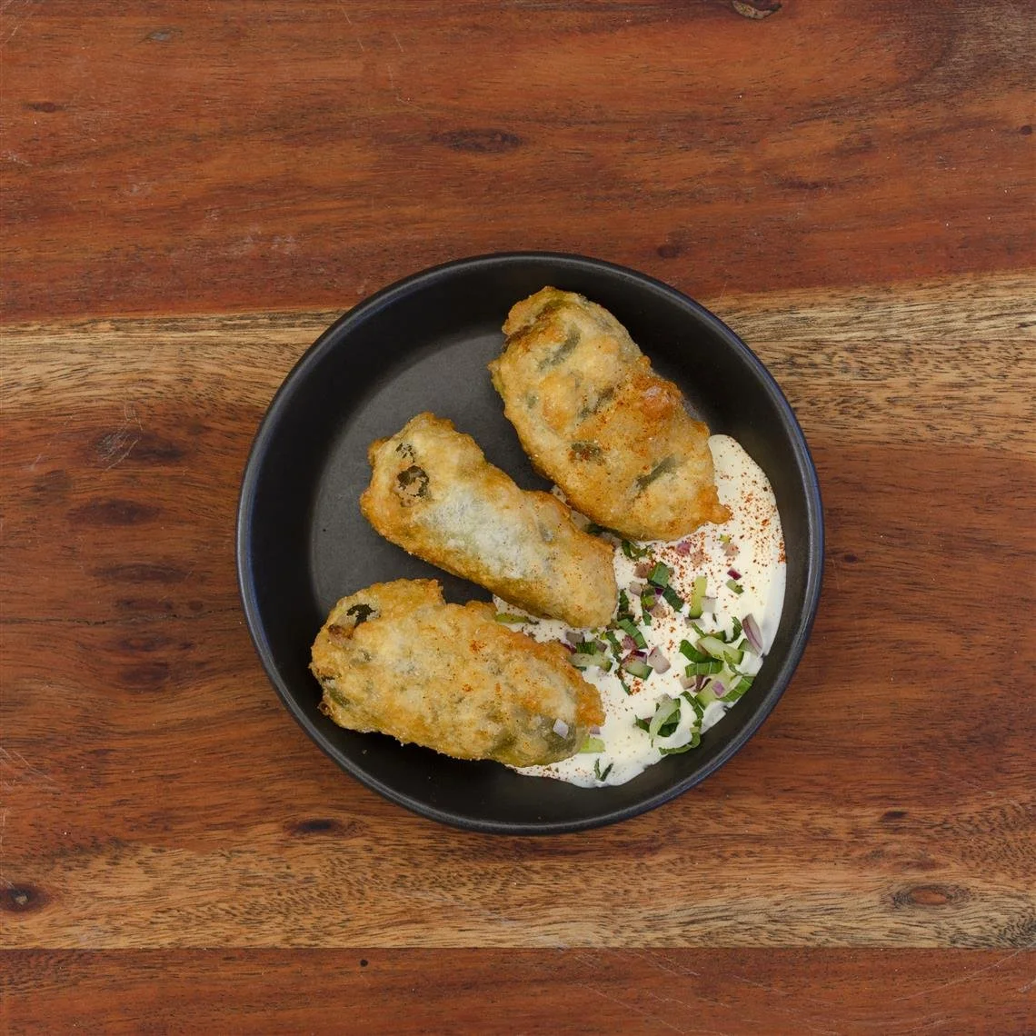 FRIED MICE, jalapenos stuffed with cheese, red peppers, tzatziki (v) $13