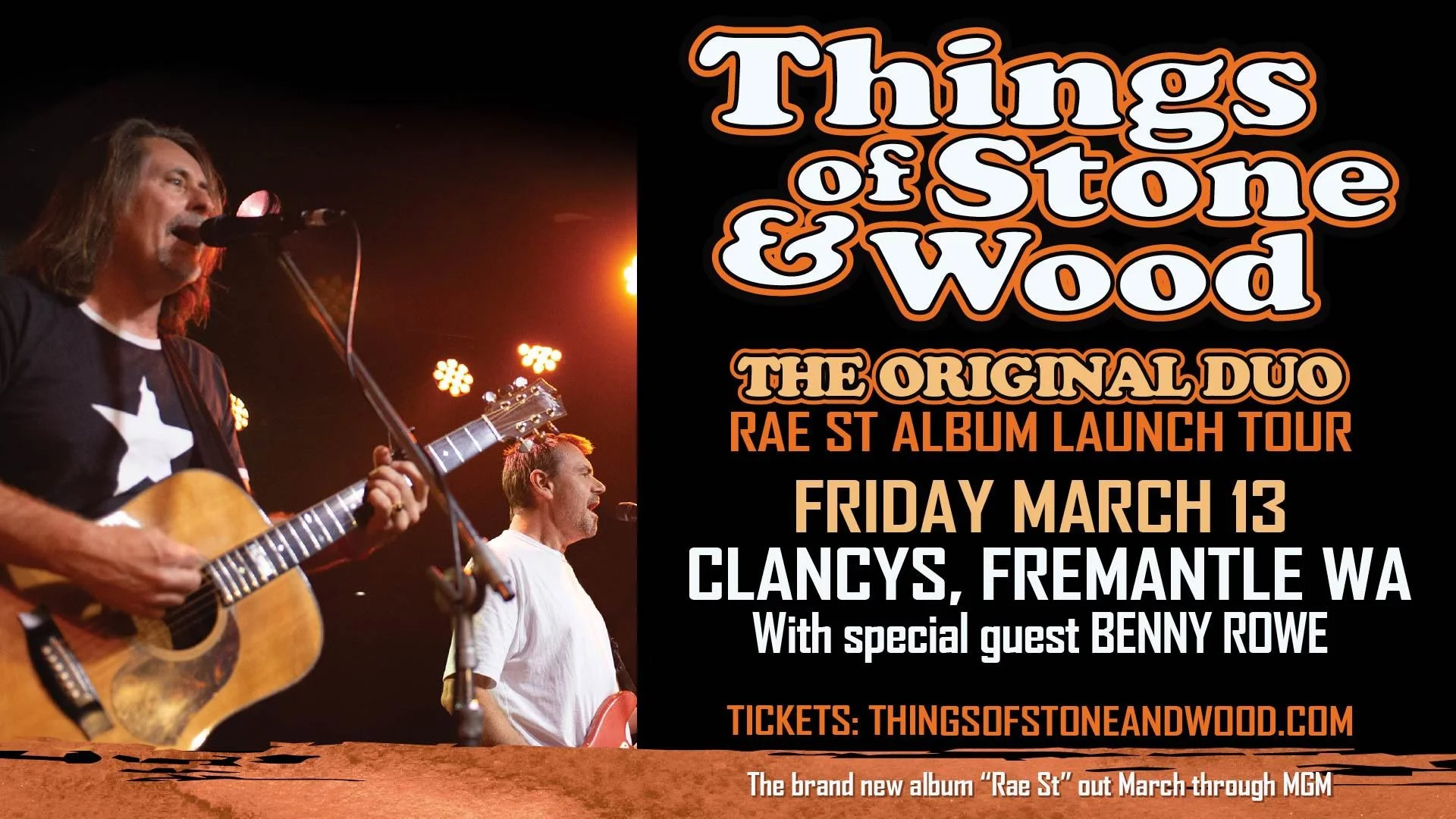 Now Greg and Mikey (also an APRA award winner), who started the whole shebang are doing a special run of shows as Things of Stone and Wood (The Original Duo) to launch the band’s brand-new acoustic album “Rae St”. Recorded at home in Melbourne “Rae St” is the first of two albums that the band are releasing in 2026 (their first albums since 2003), demonstrating that the band is still an artist folk-rocking force, and they have delivered an innovate and emotional collection of new millennium songs.